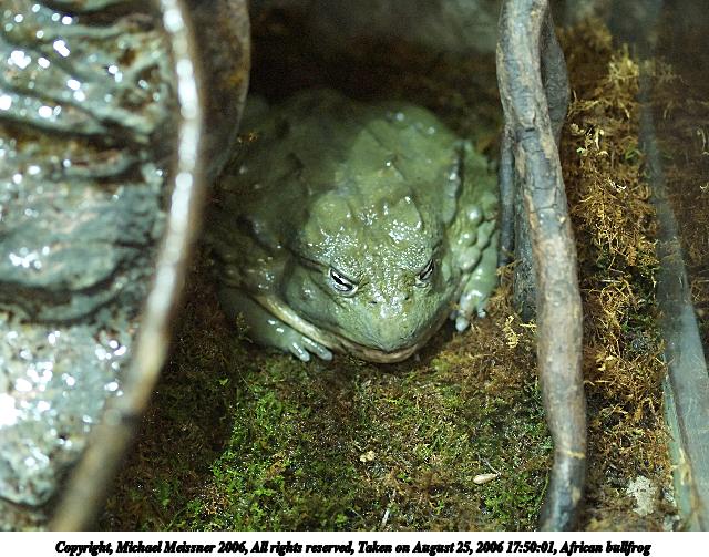 Picture #26: African bullfrog 640x503, 92,955 bytes (91K), (html file) Copyright, Michael Meissner 2006, All rights reserved Olympus E-1 camera with Olympus 50mm f/2.0 lens f/2.0, ISO 800, 1/100 sec, 50.0mm, auto mode, SHQ, matrix metering, +2 sharpening 35mm equivalent focal length 100.0mm Taken by Michael Meissner on August 25, 2006 17:50:01 Last modified on August 25, 2006 at 19:18 |