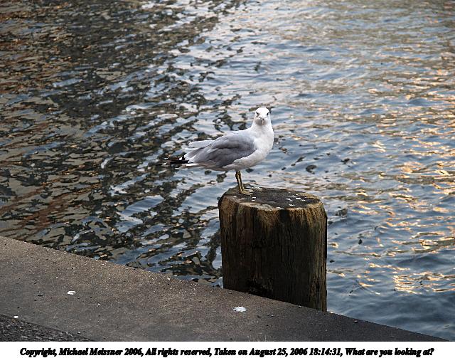 Picture #2: What are you looking at? 640x503, 96,710 bytes (95K), (html file) Copyright, Michael Meissner 2006, All rights reserved Olympus E-1 camera with Olympus 14-54mm f/2.8-3.5 lens f/3.5, ISO 100, 1/125 sec, 52.0mm, auto mode, SHQ, matrix metering, +2 sharpening 35mm equivalent focal length 104.0mm Taken by Michael Meissner on August 25, 2006 18:14:31 Last modified on August 25, 2006 at 19:19 |
