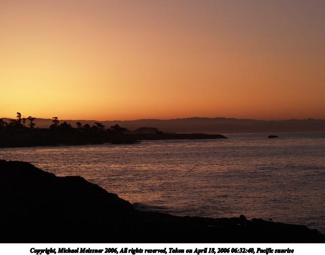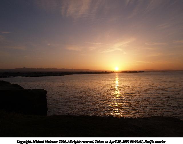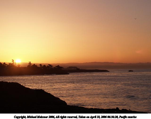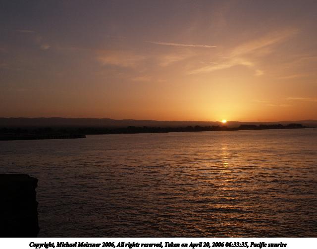 Picture #10: Pacific sunrise #8 640x503, 43,526 bytes (43K), (html file) Copyright, Michael Meissner 2006, All rights reserved Olympus E-1 camera with Olympus 14-54mm f/2.8-3.5 lens f/8.0, ISO 100, 1/250 sec, 14.0mm, aperture priority, SHQ, spot metering, +2 sharpening, Exposure bracketing (shot 1) 35mm equivalent focal length 28.0mm Taken by Michael Meissner on April 20, 2006 06:36:01 Last modified on April 23, 2006 at 03:06 |