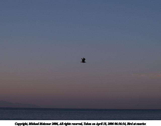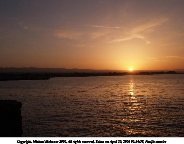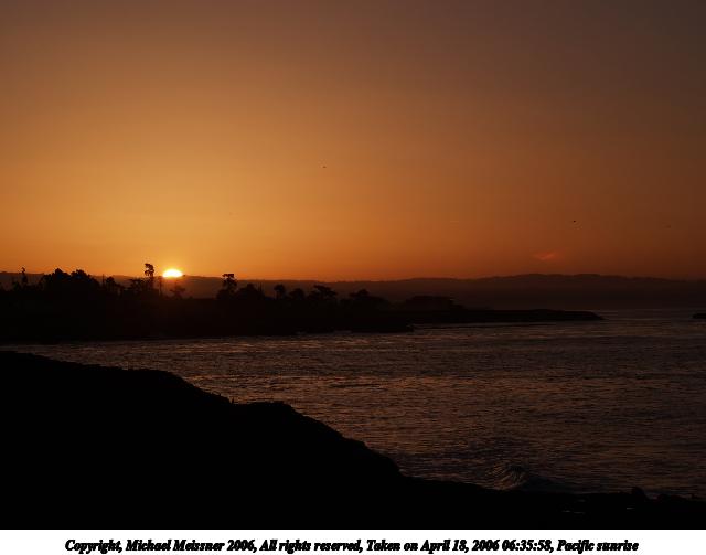 Picture #6: Pacific sunrise #4 640x503, 42,379 bytes (42K), (html file) Copyright, Michael Meissner 2006, All rights reserved Olympus E-1 camera with Olympus 14-54mm f/2.8-3.5 lens f/8.0, ISO 100, 1/320 sec, 19.0mm, aperture priority, SHQ, spot metering, bias -0.7, +2 sharpening, Exposure bracketing (shot 3) 35mm equivalent focal length 38.0mm Taken by Michael Meissner on April 20, 2006 06:32:42 Last modified on April 23, 2006 at 03:06 |