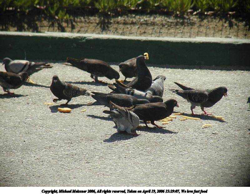 Picture #3: We love fast food 800x623, 117,014 bytes (115K), (html file) Copyright, Michael Meissner 2006, All rights reserved Olympus C-2100UZ camera f/3.2, ISO 100, 1/650 sec, 32.5mm, auto mode, SHQ, cloudy, matrix metering, bias 0.3 35mm equivalent focal length 307.0mm Extra equipment used: tcon-17, polarizer Taken by Michael Meissner on April 19, 2006 15:29:07 Last modified on April 22, 2006 at 13:31 |