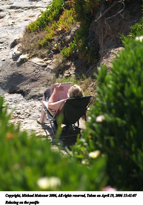 Picture #3: Relaxing on the pacific 480x686, 78,574 bytes (77K), (html file) Copyright, Michael Meissner 2006, All rights reserved Olympus E-1 camera with Olympus 50-200mm f/2.8-3.5 lens and Olympus EC-14 (1.4x) f/4.0, ISO 100, 1/125 sec, 107.0mm, auto mode, SHQ, matrix metering, +2 sharpening 35mm equivalent focal length 214.0mm, EC-14 Taken by Michael Meissner on April 19, 2006 15:41:07 Last modified on April 23, 2006 at 03:05 |