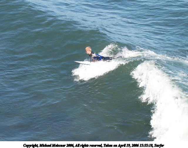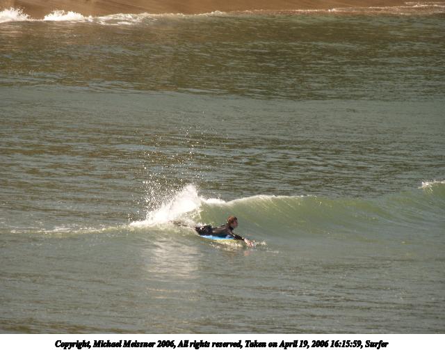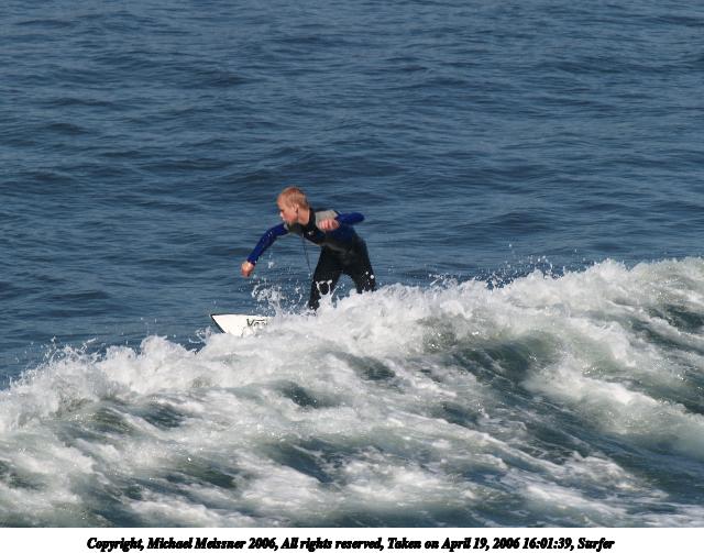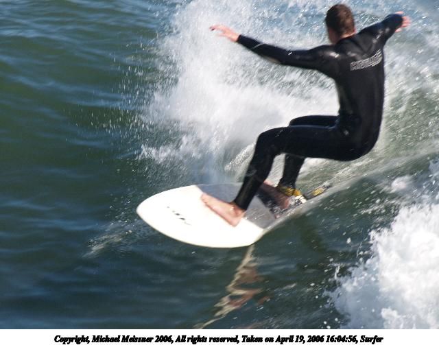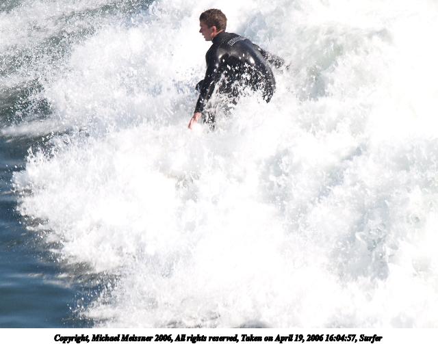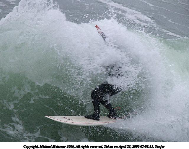 Picture #4: Surfer #4 640x503, 64,739 bytes (64K), (html file) Copyright, Michael Meissner 2006, All rights reserved Olympus E-1 camera with Olympus 50-200mm f/2.8-3.5 lens and Olympus EC-14 (1.4x) f/4.5, ISO 200, 1/250 sec, 70.0mm, auto mode, SHQ, matrix metering, +2 sharpening 35mm equivalent focal length 140.0mm, EC-14 Taken by Michael Meissner on April 19, 2006 15:55:18 Last modified on April 23, 2006 at 03:05 |