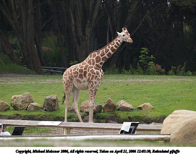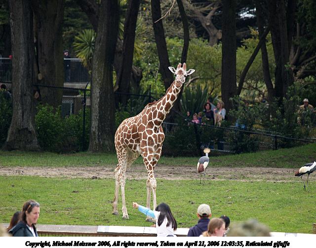 Picture #2: Reticulated gifaffe #2 640x503, 82,059 bytes (81K), (html file) Copyright, Michael Meissner 2006, All rights reserved Olympus E-1 camera with Olympus 50-200mm f/2.8-3.5 lens f/4.0, ISO 100, 1/250 sec, 182.0mm, auto mode, SHQ, matrix metering, +2 sharpening 35mm equivalent focal length 365.0mm Taken by Michael Meissner on April 21, 2006 12:03:35 Last modified on May 22, 2006 at 22:28 |