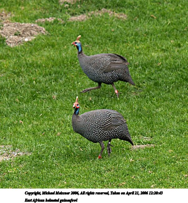 Picture #2: East African helmeted guineafowl #2 640x503, 110,960 bytes (109K), (html file) Copyright, Michael Meissner 2006, All rights reserved Olympus E-1 camera with Olympus 50-200mm f/2.8-3.5 lens f/5.0, ISO 200, 1/500 sec, 169.0mm, auto mode, SHQ, matrix metering, +2 sharpening 35mm equivalent focal length 339.0mm Taken by Michael Meissner on April 21, 2006 12:20:55 Last modified on April 21, 2006 at 20:46 |