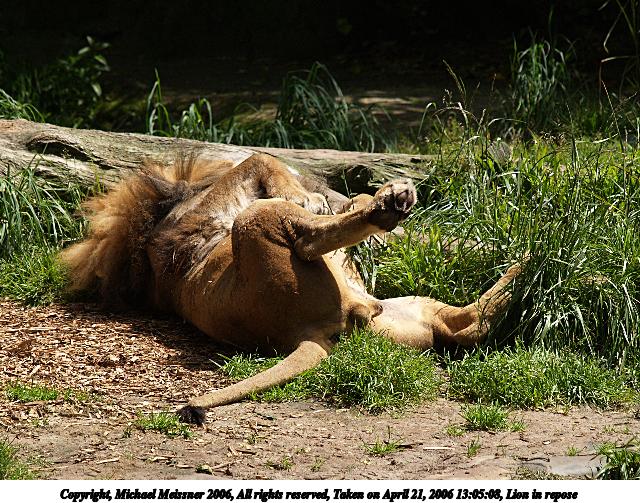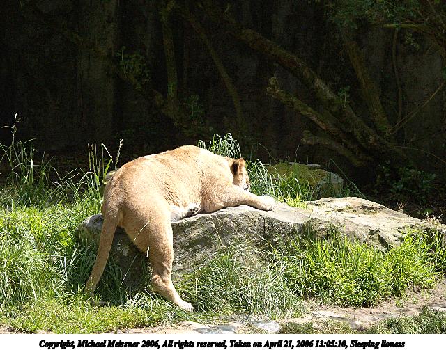 Picture #2: Sleeping lioness 640x503, 108,864 bytes (107K), (html file) Copyright, Michael Meissner 2006, All rights reserved Olympus E-1 camera with Olympus 50-200mm f/2.8-3.5 lens f/5.6, ISO 200, 1/800 sec, 104.0mm, auto mode, SHQ, matrix metering, +2 sharpening 35mm equivalent focal length 208.0mm Taken by Michael Meissner on April 21, 2006 13:05:10 Last modified on April 21, 2006 at 20:48 |