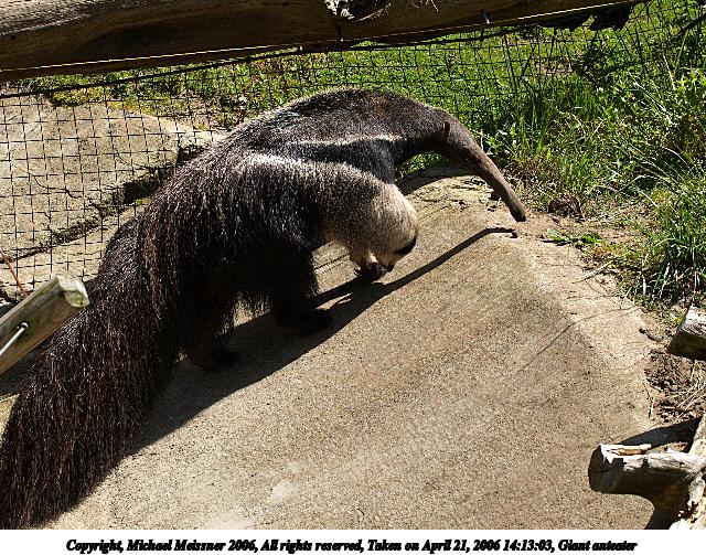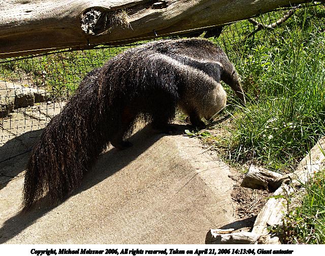 Picture #2: Giant anteater #2 640x503, 145,476 bytes (143K), (html file) Copyright, Michael Meissner 2006, All rights reserved Olympus E-1 camera with Olympus 50-200mm f/2.8-3.5 lens f/5.6, ISO 200, 1/500 sec, 50.0mm, auto mode, SHQ, matrix metering, +2 sharpening 35mm equivalent focal length 100.0mm Taken by Michael Meissner on April 21, 2006 14:13:04 Last modified on April 21, 2006 at 20:49 |