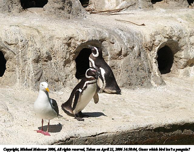 Picture #6: Guess which bird isn't a penguin? 640x503, 114,426 bytes (112K), (html file) Copyright, Michael Meissner 2006, All rights reserved Olympus E-1 camera with Olympus 50-200mm f/2.8-3.5 lens f/7.1, ISO 200, 1/1250 sec, 88.0mm, auto mode, SHQ, matrix metering, +2 sharpening 35mm equivalent focal length 176.0mm Taken by Michael Meissner on April 21, 2006 14:50:04 Last modified on April 21, 2006 at 20:50 |