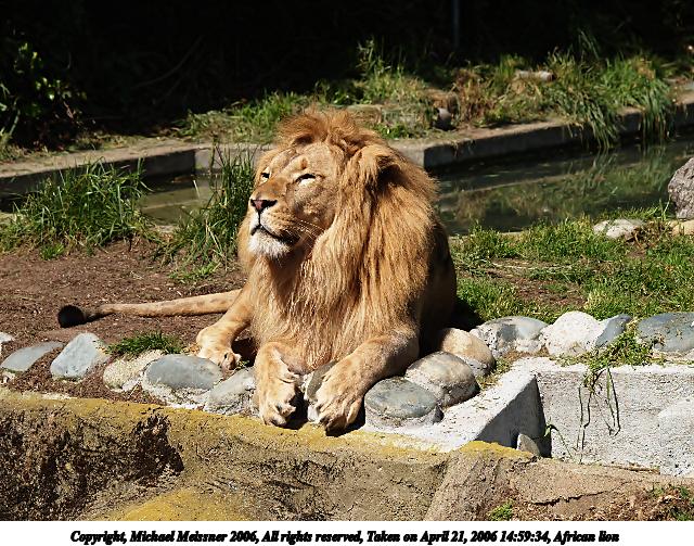 Picture #4: African lion 640x503, 115,052 bytes (113K), (html file) Copyright, Michael Meissner 2006, All rights reserved Olympus E-1 camera with Olympus 50-200mm f/2.8-3.5 lens f/6.3, ISO 200, 1/1000 sec, 104.0mm, auto mode, SHQ, matrix metering, +2 sharpening 35mm equivalent focal length 208.0mm Taken by Michael Meissner on April 21, 2006 14:59:34 Last modified on April 21, 2006 at 20:51 |