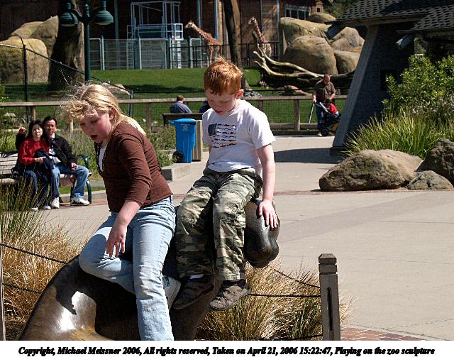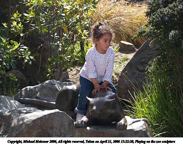 Picture #4: Playing on the zoo sculpture #2 640x503, 102,278 bytes (100K), (html file) Copyright, Michael Meissner 2006, All rights reserved Olympus E-1 camera with Olympus 50-200mm f/2.8-3.5 lens f/8.0, ISO 400, 1/1000 sec, 56.0mm, auto mode, SHQ, matrix metering, +2 sharpening 35mm equivalent focal length 112.0mm Taken by Michael Meissner on April 21, 2006 15:22:47 Last modified on April 21, 2006 at 20:52 |