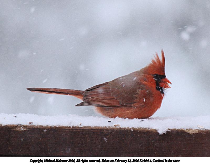 Picture #1: Cardinal in the snow 800x623, 64,830 bytes (64K), (html file) Copyright, Michael Meissner 2006, All rights reserved Olympus E-1 camera with Olympus 50-200mm f/2.8-3.5 lens f/3.5, ISO 400, 1/250 sec, 200.0mm, auto mode, SHQ, matrix metering, +2 sharpening 35mm equivalent focal length 401.0mm Taken by Michael Meissner on February 12, 2006 12:30:34 Last modified on February 12, 2006 at 12:58 The file originally appeared in http://www.the-meissners.org/2006-small-albums/2006-02/index.html. |