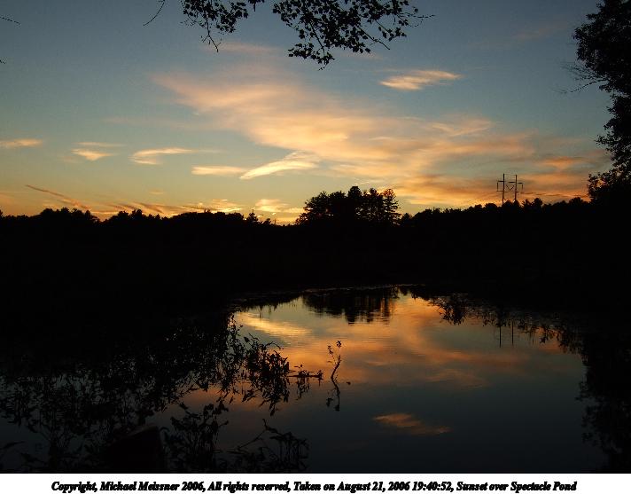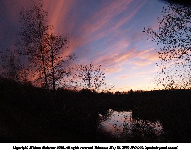 Picture #6: Sunset over Spectacle Pond #3 640x503, 79,299 bytes (78K), (html file) Copyright, Michael Meissner 2006, All rights reserved Olympus E-1 camera with Olympus 11-22mm f/2.8-3.5 lens f/7.1, ISO 100, 1/200 sec, 11.0mm, auto mode, SHQ, matrix metering, +2 sharpening, Exposure bracketing (shot 1) 35mm equivalent focal length 22.0mm Taken by Michael Meissner on May 25, 2006 19:55:06 Last modified on May 25, 2006 at 23:40 The file originally appeared in http://www.the-meissners.org/2006-small-albums/2006-05/index.html. |