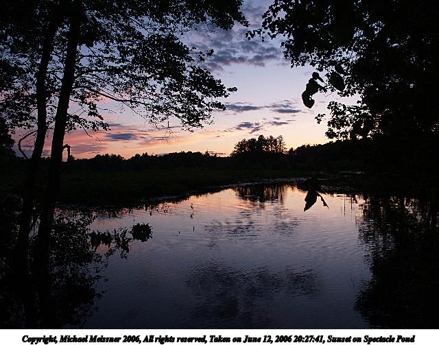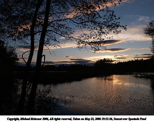 Picture #3: Sunset over Spectacle Pond 640x503, 93,941 bytes (92K), (html file) Copyright, Michael Meissner 2006, All rights reserved Olympus E-1 camera with Olympus 14-54mm f/2.8-3.5 lens f/8.0, ISO 100, 1/250 sec, 14.0mm, auto mode, SHQ, spot metering, +2 sharpening, Exposure bracketing (shot 1) 35mm equivalent focal length 28.0mm Extra equipment used: monopod Taken by Michael Meissner on May 23, 2006 19:51:36 Last modified on May 23, 2006 at 21:18 The file originally appeared in http://www.the-meissners.org/2006-small-albums/2006-05/index.html. |