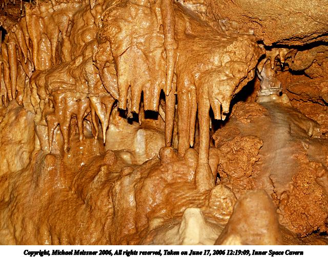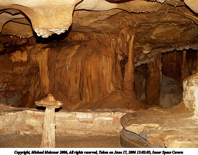 Picture #3: Inner Space Cavern #3 640x503, 87,235 bytes (86K), (html file) Copyright, Michael Meissner 2006, All rights reserved Olympus E-1 camera with Olympus 14-54mm f/2.8-3.5 lens f/3.3, ISO 400, ext. flash, 1/80 sec, 43.0mm, auto mode, SHQ, matrix metering, +2 sharpening 35mm equivalent focal length 86.0mm Extra equipment used: Promaster 5750DX flash Taken by Michael Meissner on June 17, 2006 13:02:03 Last modified on June 18, 2006 at 12:34 The pedestal did not grow there naturally, but was placed there because people kept hitting their head on the stalactite on the ceiling. The file originally appeared in http://www.the-meissners.org/2006-small-albums/2006-06/index.html. |
