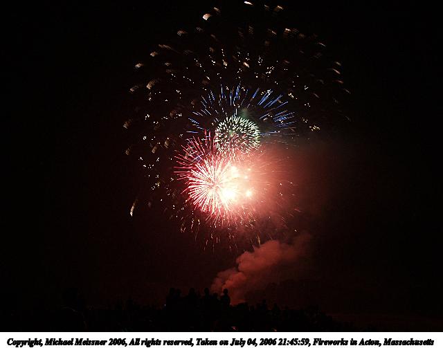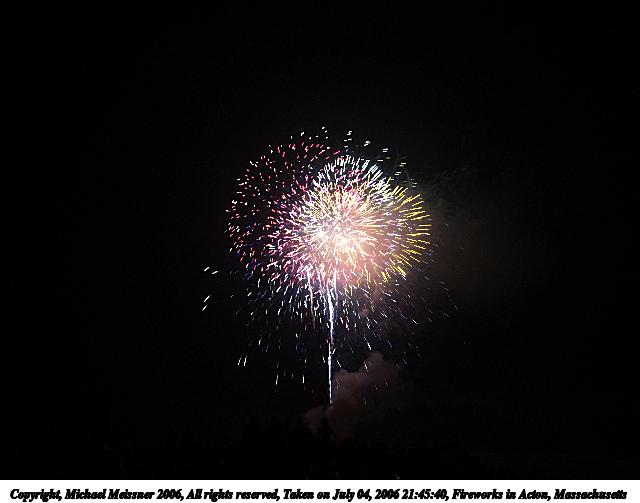 Picture #2: Fireworks in Acton, Massachusetts #2 640x503, 50,991 bytes (50K), (html file) Copyright, Michael Meissner 2006, All rights reserved Olympus E-1 camera with Olympus 11-22mm f/2.8-3.5 lens f/5.6, ISO 100, 1/2 sec, 13.0mm, manual mode, SHQ, matrix metering, +2 sharpening, manual focus 35mm equivalent focal length 26.0mm Extra equipment used: tripod, rm-cb01 wired shutter release, bulb mode Taken by Michael Meissner on July 04, 2006 21:45:59 Last modified on July 04, 2006 at 23:37 The file originally appeared in http://www.the-meissners.org/2006-small-albums/2006-07/index.html. |