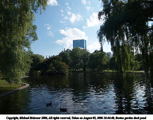 Picture #2: Boston garden duck pond 640x503, 101,117 bytes (99K), (html file) Copyright, Michael Meissner 2006, All rights reserved Olympus E-1 camera with Olympus 11-22mm f/2.8-3.5 lens f/8.0, ISO 100, 1/320 sec, 11.0mm, auto mode, SHQ, matrix metering, +2 sharpening 35mm equivalent focal length 22.0mm Taken by Michael Meissner on August 05, 2006 16:44:40 Last modified on August 05, 2006 at 19:28 The file originally appeared in http://www.the-meissners.org/2006-small-albums/2006-08/index.html. |