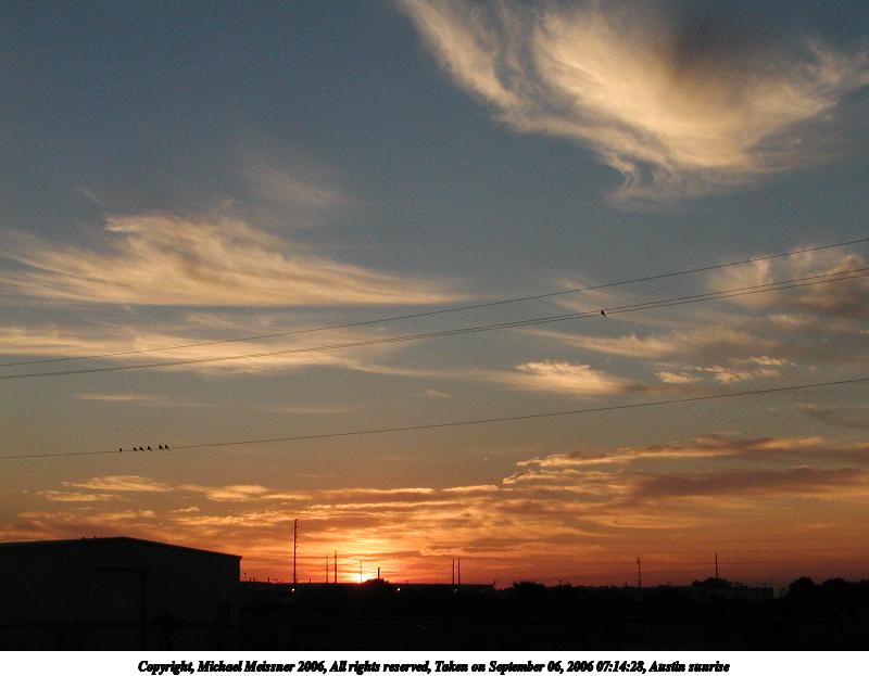 Picture #1: Austin sunrise 800x623, 50,294 bytes (50K), (html file) Copyright, Michael Meissner 2006, All rights reserved Olympus C-2100UZ camera f/6.3, ISO 200, 1/650 sec, 10.7mm, auto mode, SHQ, cloudy, spot metering 35mm equivalent focal length 59.0mm Taken by Michael Meissner on September 06, 2006 07:14:28 Last modified on September 09, 2006 at 22:21 The file originally appeared in http://www.the-meissners.org/2006-small-albums/2006-09/index.html. |