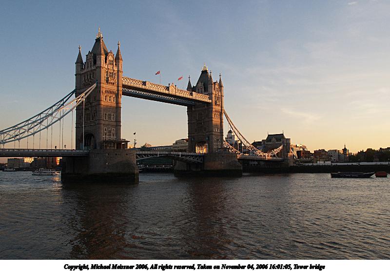 Picture #19: The Tower Bridge at sunset 640x503, 51,104 bytes (50K), (html file) Copyright, Michael Meissner 2006, All rights reserved Olympus E-1 camera with Olympus 14-54mm f/2.8-3.5 lens f/4.5, ISO 800, 1/160 sec, 40.0mm, auto mode, SHQ, spot metering, bias -0.7, +2 sharpening, Exposure bracketing (shot 2) 35mm equivalent focal length 80.0mm Taken by Michael Meissner on November 05, 2006 16:32:10 Last modified on November 14, 2006 at 06:36 The file originally appeared in http://www.the-meissners.org/2006-small-albums/2006-london/index.html. |
