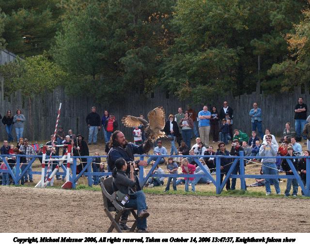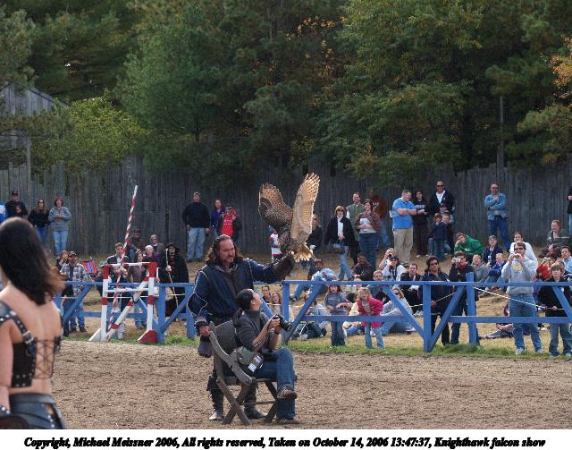 Picture #2: Knighthawk falcon show #2 640x503, 93,766 bytes (92K), (html file) Copyright, Michael Meissner 2006, All rights reserved Olympus E-1 camera with Olympus 50-200mm f/2.8-3.5 lens f/4.5, ISO 400, 1/400 sec, 72.0mm, auto mode, SHQ, matrix metering, +2 sharpening 35mm equivalent focal length 144.0mm Taken by Michael Meissner on October 14, 2006 13:47:37 Last modified on October 14, 2006 at 21:54 The file originally appeared in http://www.the-meissners.org/2006-small-albums/2006-krf/index.html. |