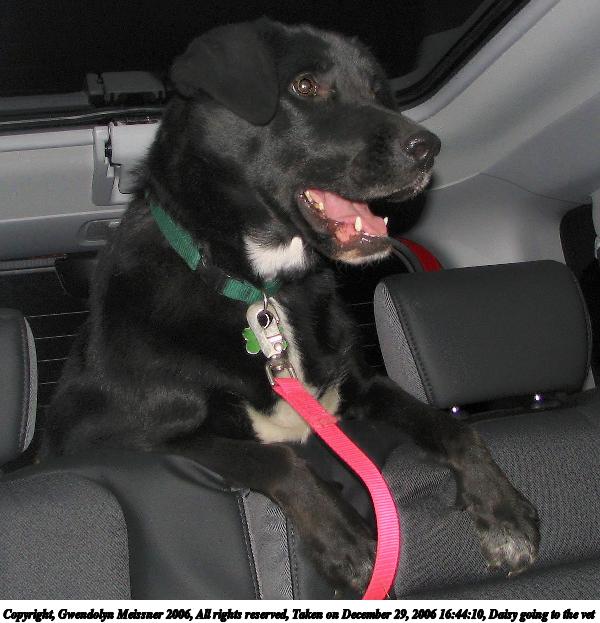 Picture #1: Daisy going to the vet 600x623, 60,785 bytes (60K), (html file) Copyright, Gwendolyn Meissner 2006, All rights reserved Canon S1 camera f/2.8, ISO 50, flash, 1/60 sec, 5.8mm, Superfine, Evaluative, image stabilization 35mm equivalent focal length 38.0mm Taken by Gwendolyn Meissner on December 29, 2006 16:44:10 Last modified on December 30, 2006 at 15:25 The file originally appeared in http://www.the-meissners.org/2006-small-albums/2006-12/index.html. |