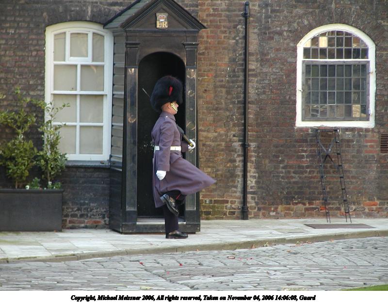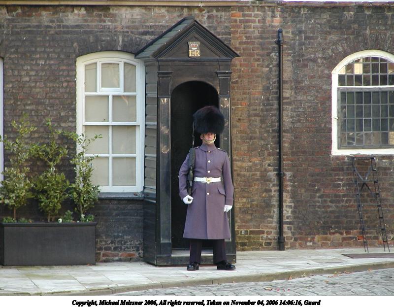 Picture #122: Guard #2 800x623, 96,418 bytes (95K), (html file) Copyright, Michael Meissner 2006, All rights reserved Olympus C-2100UZ camera f/2.8, ISO 100, 1/60 sec, 41.3mm, auto mode, SHQ, cloudy, matrix metering 35mm equivalent focal length 229.0mm Taken by Michael Meissner on November 04, 2006 14:06:16 Last modified on November 14, 2006 at 06:41 |