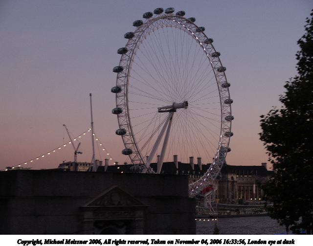 Picture #92: London eye at dusk 640x503, 49,001 bytes (48K), (html file) Copyright, Michael Meissner 2006, All rights reserved Olympus E-1 camera with Olympus 14-54mm f/2.8-3.5 lens f/4.0, ISO 200, 1/100 sec, 32.0mm, auto mode, SHQ, matrix metering, +2 sharpening 35mm equivalent focal length 64.0mm Taken by Michael Meissner on November 04, 2006 16:33:56 Last modified on November 14, 2006 at 06:31 |