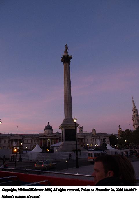 Picture #91: Nelson's column at sunset 480x686, 39,649 bytes (39K), (html file) Copyright, Michael Meissner 2006, All rights reserved Olympus E-1 camera with Olympus 14-54mm f/2.8-3.5 lens f/3.5, ISO 200, 1/50 sec, 14.0mm, auto mode, SHQ, matrix metering, +2 sharpening, Exposure bracketing (shot 1) 35mm equivalent focal length 28.0mm Taken by Michael Meissner on November 04, 2006 16:40:10 Last modified on November 14, 2006 at 06:31 |