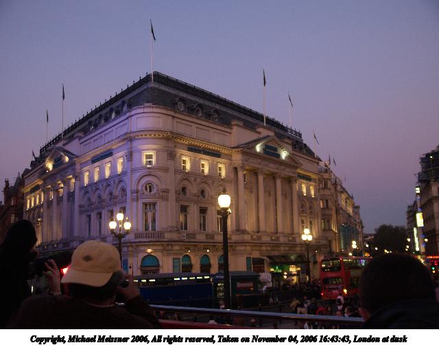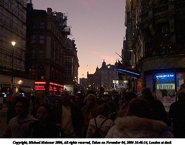 Picture #89: London at dusk #2 640x503, 67,687 bytes (67K), (html file) Copyright, Michael Meissner 2006, All rights reserved Olympus E-1 camera with Olympus 14-54mm f/2.8-3.5 lens f/4.0, ISO 200, 1/80 sec, 22.0mm, auto mode, SHQ, matrix metering, +2 sharpening, Exposure bracketing (shot 1) 35mm equivalent focal length 44.0mm Taken by Michael Meissner on November 04, 2006 16:46:14 Last modified on November 14, 2006 at 06:31 |