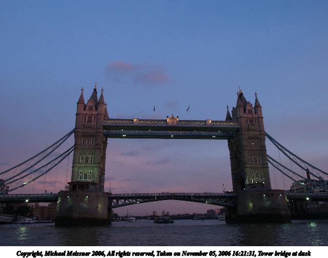 Picture #72: Tower bridge at dusk 640x503, 49,469 bytes (49K), (html file) Copyright, Michael Meissner 2006, All rights reserved Olympus E-1 camera with Olympus 14-54mm f/2.8-3.5 lens f/5.0, ISO 400, 1/125 sec, 14.0mm, auto mode, SHQ, matrix metering, +2 sharpening 35mm equivalent focal length 28.0mm Taken by Michael Meissner on November 05, 2006 16:21:31 Last modified on November 14, 2006 at 06:36 This picture is one of my favorites. |