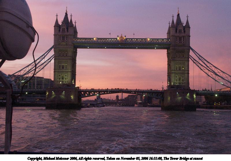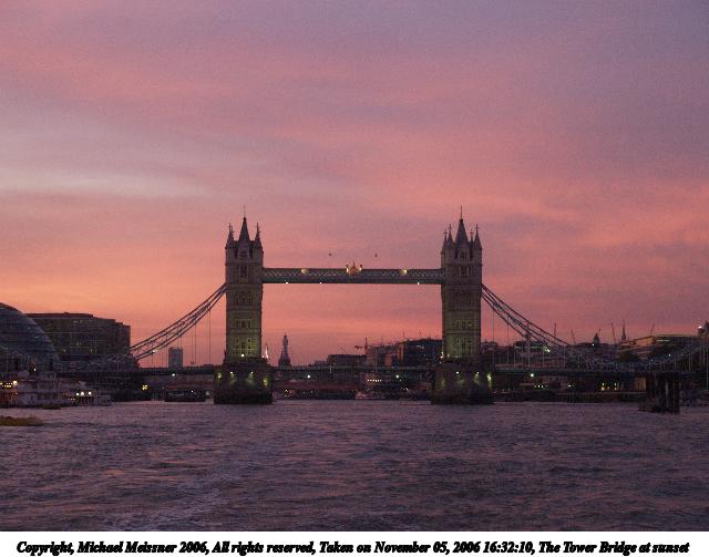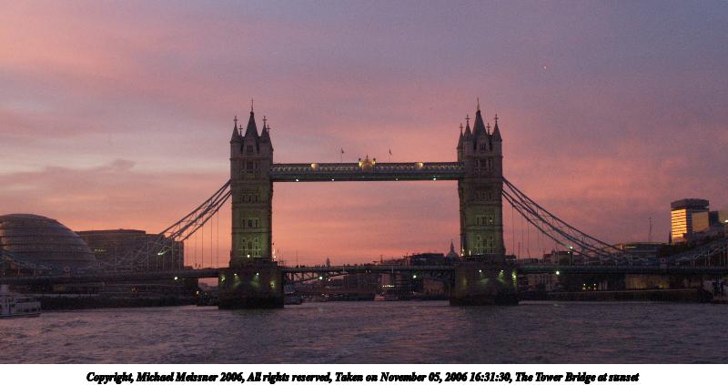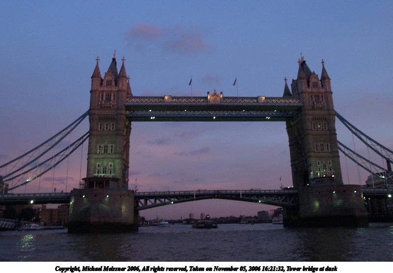 Picture #65: The Tower Bridge at sunset #3 640x503, 51,104 bytes (50K), (html file) Copyright, Michael Meissner 2006, All rights reserved Olympus E-1 camera with Olympus 14-54mm f/2.8-3.5 lens f/4.5, ISO 800, 1/160 sec, 40.0mm, auto mode, SHQ, spot metering, bias -0.7, +2 sharpening, Exposure bracketing (shot 2) 35mm equivalent focal length 80.0mm Taken by Michael Meissner on November 05, 2006 16:32:10 Last modified on November 14, 2006 at 06:36 This picture is one of my favorites. |