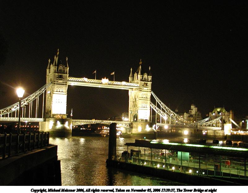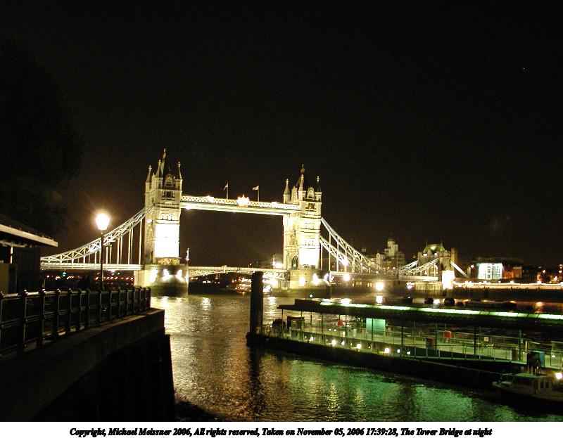 Picture #56: The Tower Bridge at night #2 800x623, 82,185 bytes (81K), (html file) Copyright, Michael Meissner 2006, All rights reserved Olympus C-2100UZ camera f/2.8, ISO 400, 1/5 sec, 9.4mm, auto mode, SHQ, cloudy, matrix metering 35mm equivalent focal length 52.0mm Taken by Michael Meissner on November 05, 2006 17:39:37 Last modified on November 14, 2006 at 06:41 |