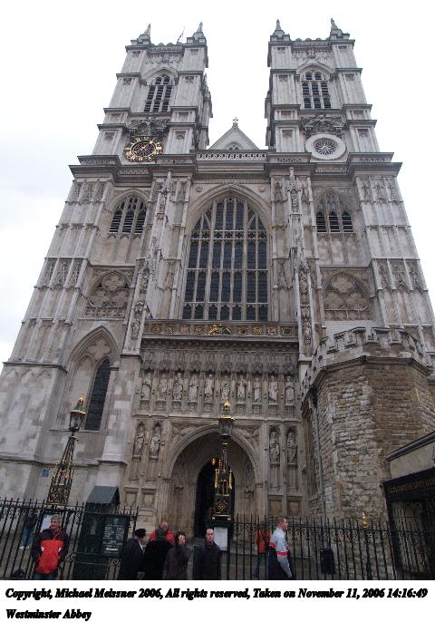 Picture #46: Westminster Abbey #6 640x503, 102,482 bytes (101K), (html file) Copyright, Michael Meissner 2006, All rights reserved Olympus E-1 camera with Olympus 14-54mm f/2.8-3.5 lens f/5.0, ISO 400, 1/160 sec, 23.0mm, auto mode, SHQ, center weight metering, +2 sharpening 35mm equivalent focal length 46.0mm Taken by Michael Meissner on November 11, 2006 12:24:56 Last modified on November 14, 2006 at 06:39 |