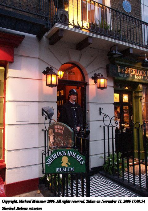 Picture #19: Sherlock Holmes museum #2 480x686, 82,251 bytes (81K), (html file) Copyright, Michael Meissner 2006, All rights reserved Olympus E-1 camera with Olympus 14-54mm f/2.8-3.5 lens f/3.2, ISO 800, 1/40 sec, 14.0mm, auto mode, SHQ, matrix metering, +2 sharpening 35mm equivalent focal length 28.0mm Taken by Michael Meissner on November 11, 2006 17:00:54 Last modified on November 14, 2006 at 06:39 |