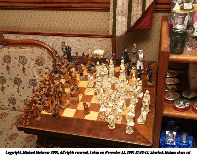 Picture #7: Sherlock Holmes chess set 640x503, 94,467 bytes (93K), (html file) Copyright, Michael Meissner 2006, All rights reserved Olympus E-1 camera with Olympus 14-54mm f/2.8-3.5 lens f/5.6, ISO 200, FL-50 flash, 1/40 sec, 20.0mm, aperture priority, SHQ, matrix metering, +2 sharpening 35mm equivalent focal length 40.0mm Taken by Michael Meissner on November 11, 2006 17:20:12 Last modified on November 14, 2006 at 06:39 |