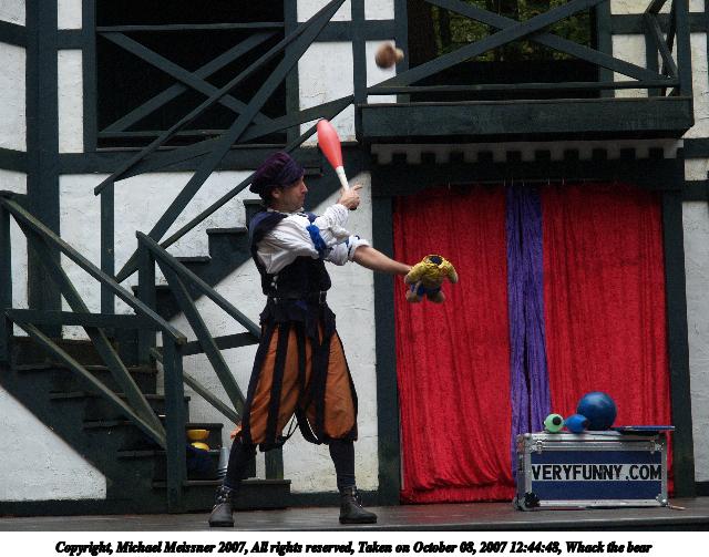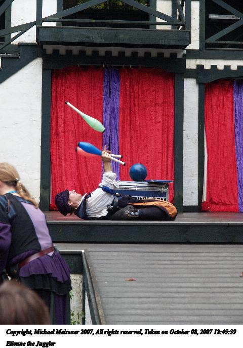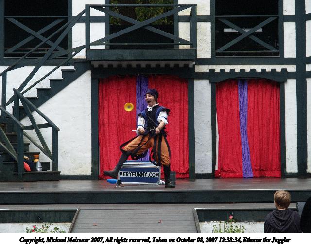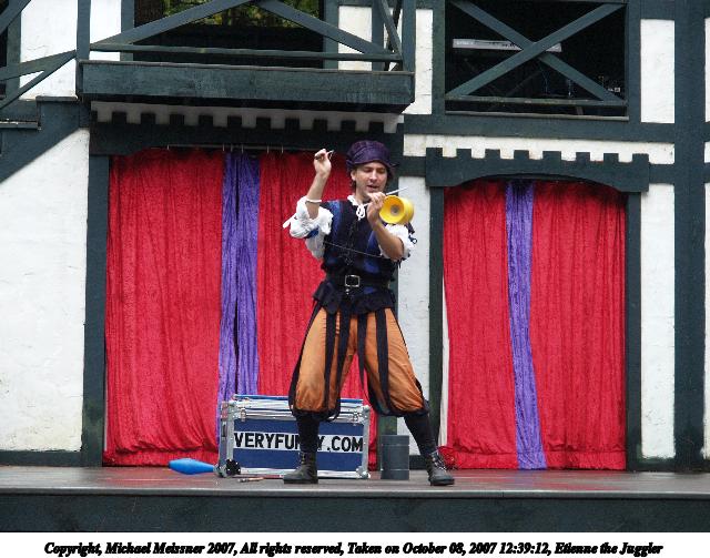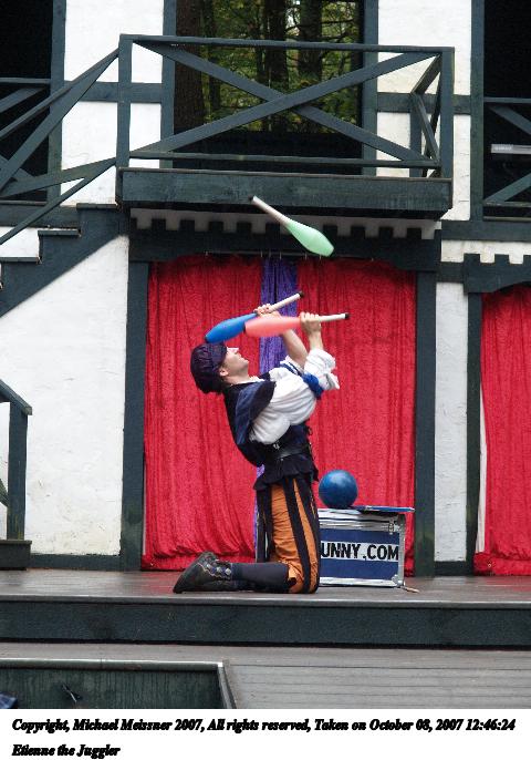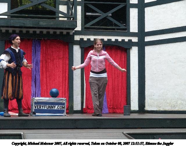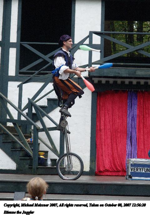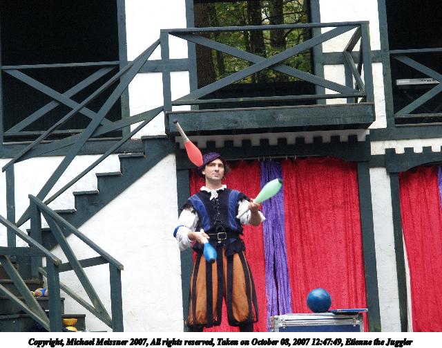 Picture #9: Etienne the Juggler #8 Thumb: 320x240, 30,832 bytes (31K) Small: 640x503, 77,896 bytes (77K), (html file) Large: 2560x1920, 3,381,666 bytes (3.2M), (html file) Copyright, Michael Meissner 2007, All rights reserved Olympus E-1 camera with Olympus 14-54mm f/2.8-3.5 lens f/4.5, ISO 400, 1/160 sec, 54.0mm, auto mode, SHQ, matrix metering, +2 sharpening 35mm equivalent focal length 108.0mm Taken by Michael Meissner on October 08, 2007 12:47:49 Last modified on October 08, 2007 at 12:47 |