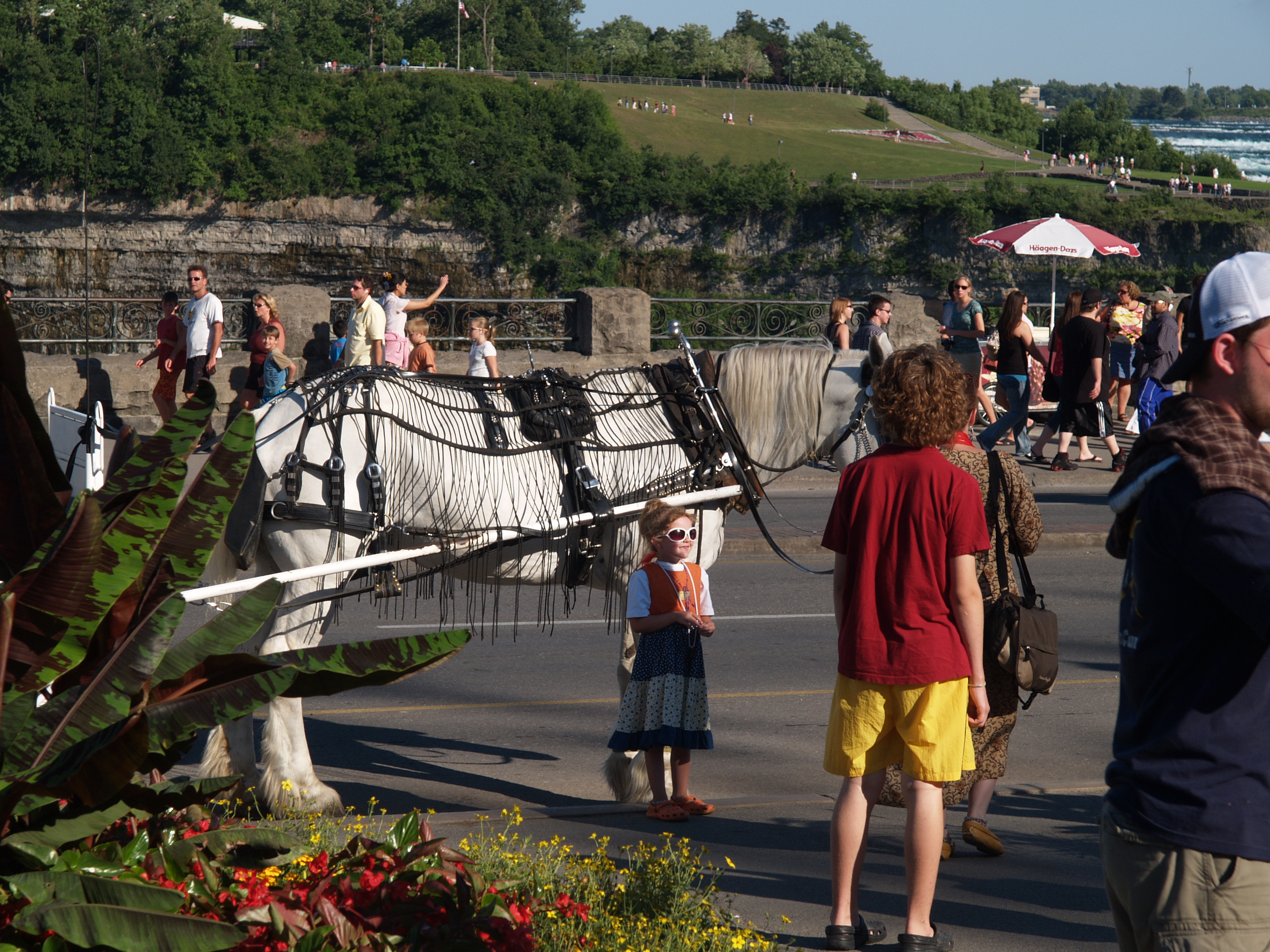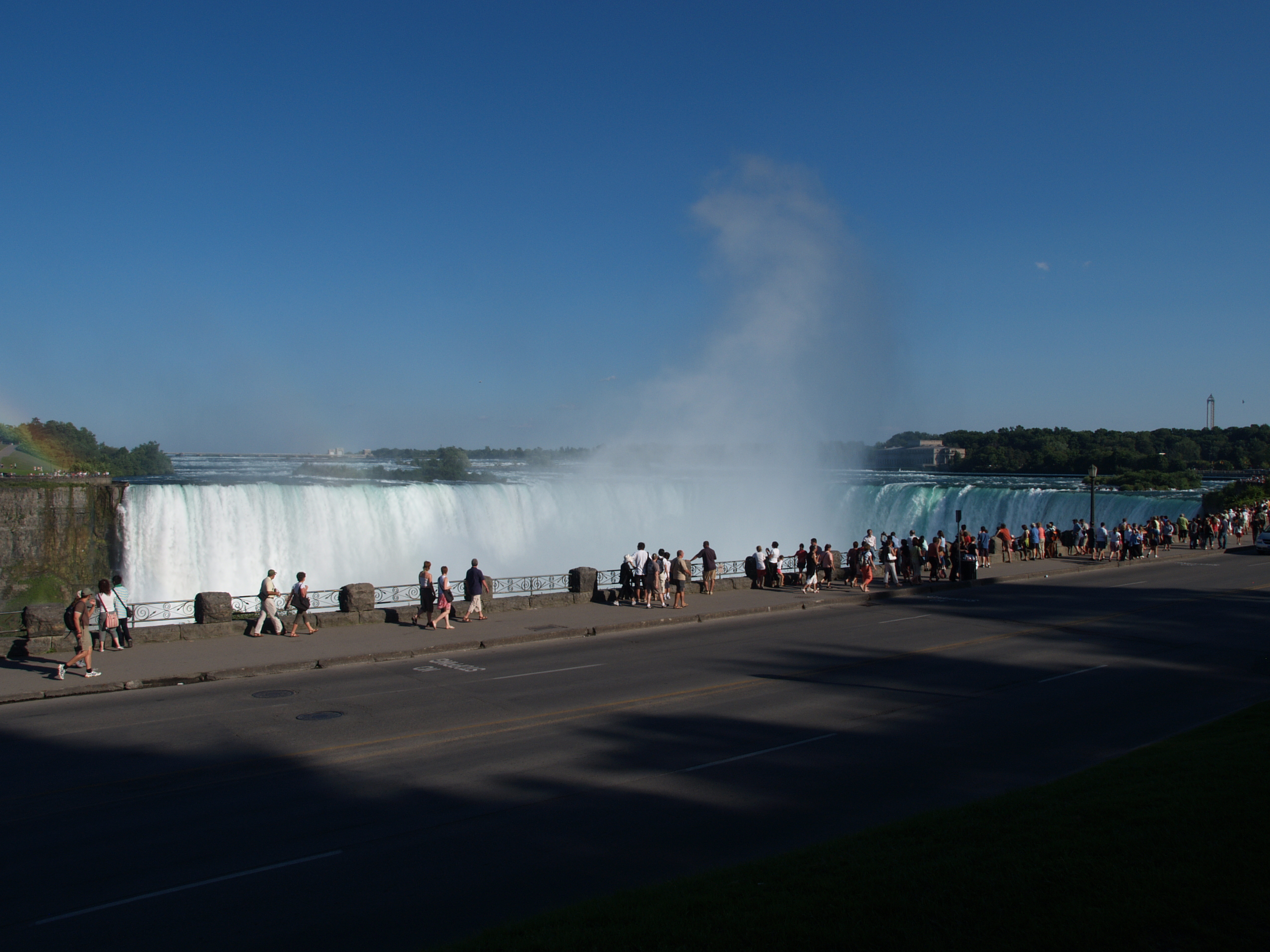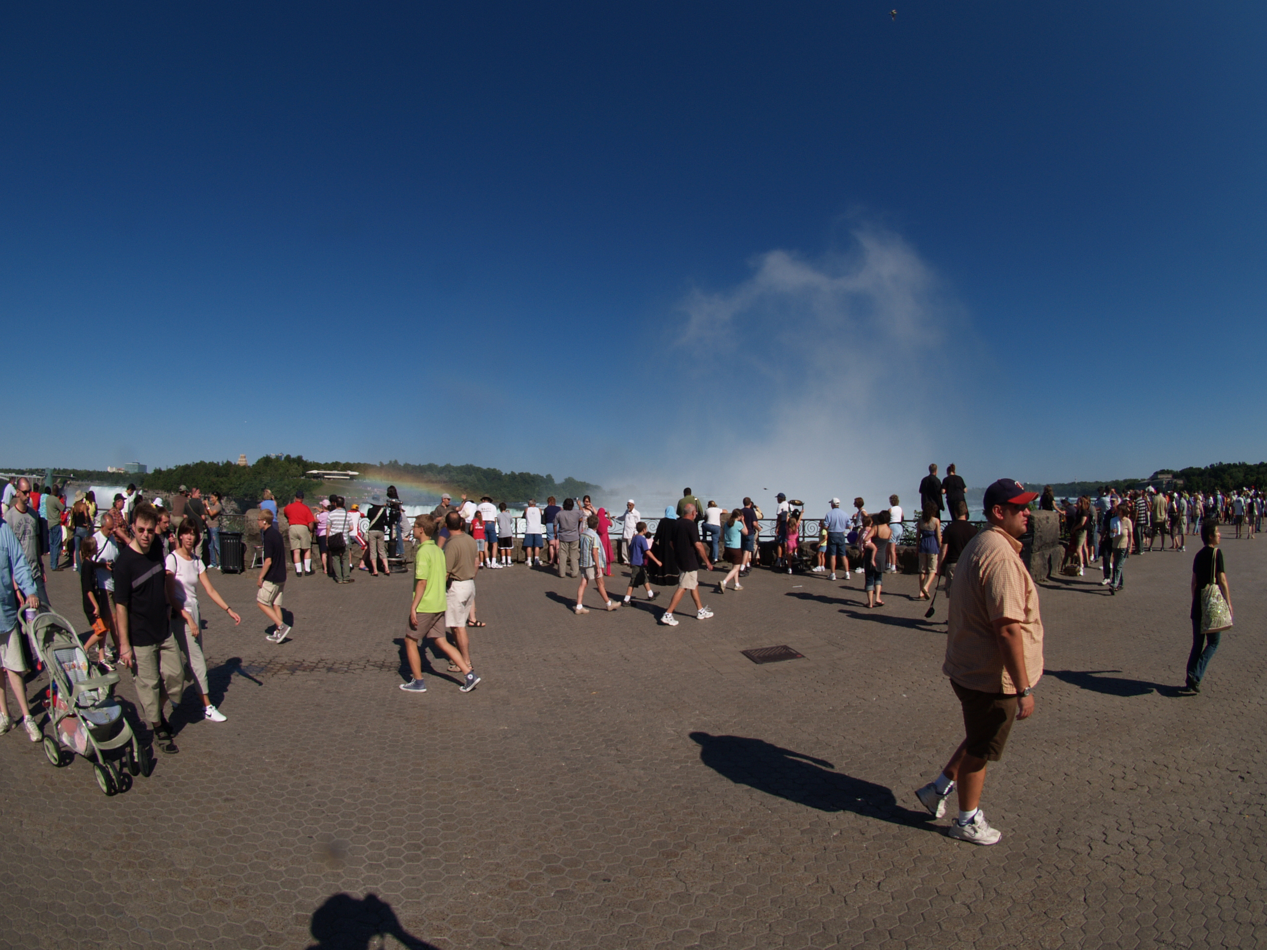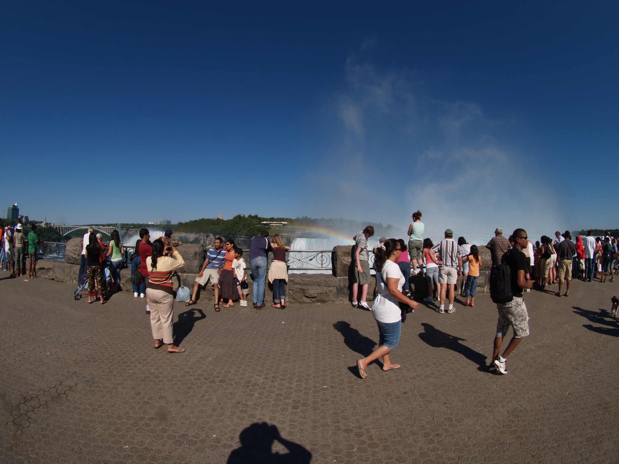 Picture #4: Niagara Falls crowds Thumb: 320x240, 21,603 bytes (22K) Small: 640x503, 54,737 bytes (54K), (html file) Large: 2560x1920, 3,652,978 bytes (3.5M), (html file) Copyright, Michael Meissner 2007, All rights reserved Olympus E-1 camera with Olympus 8mm f/3.5 lens f/10.0, ISO 100, 1/320 sec, 8.0mm, auto mode, SHQ, matrix metering, +2 sharpening, Exposure bracketing (shot 1) 35mm equivalent focal length 16.0mm Taken by Michael Meissner on August 13, 2007 16:36:30 Last modified on August 13, 2007 at 16:36 Note, this is taken with a very wide lens, and the people are distorted. |