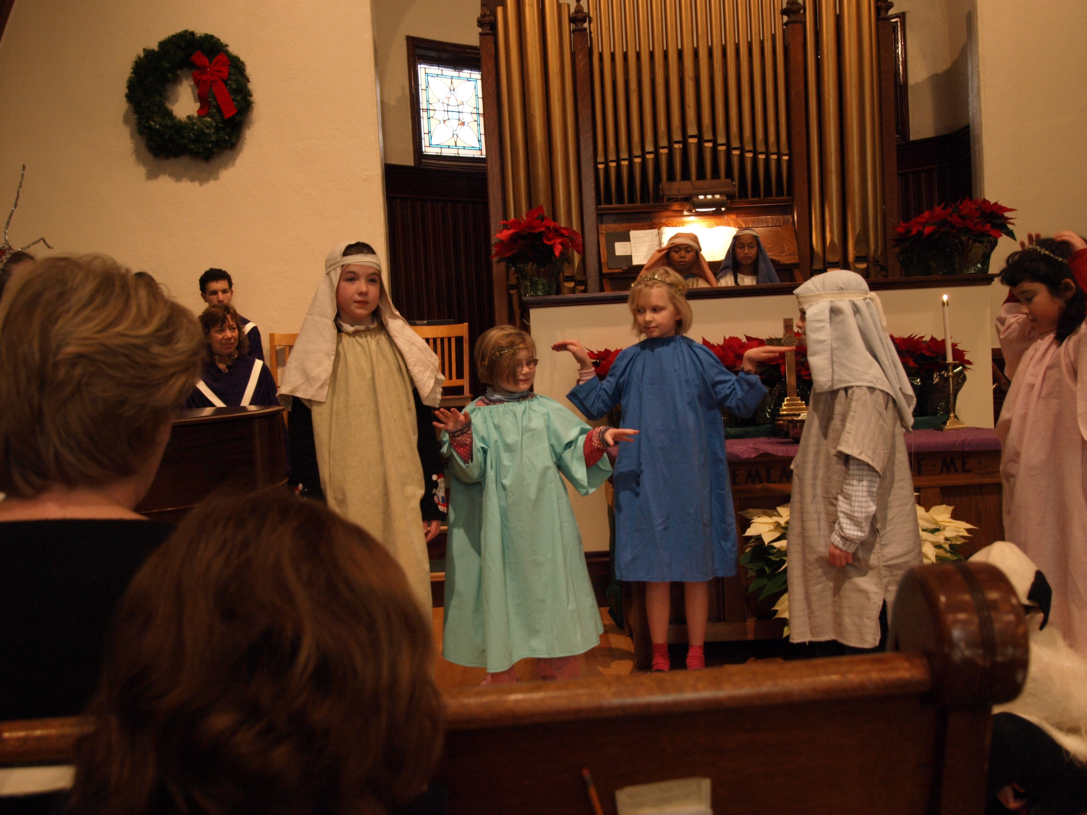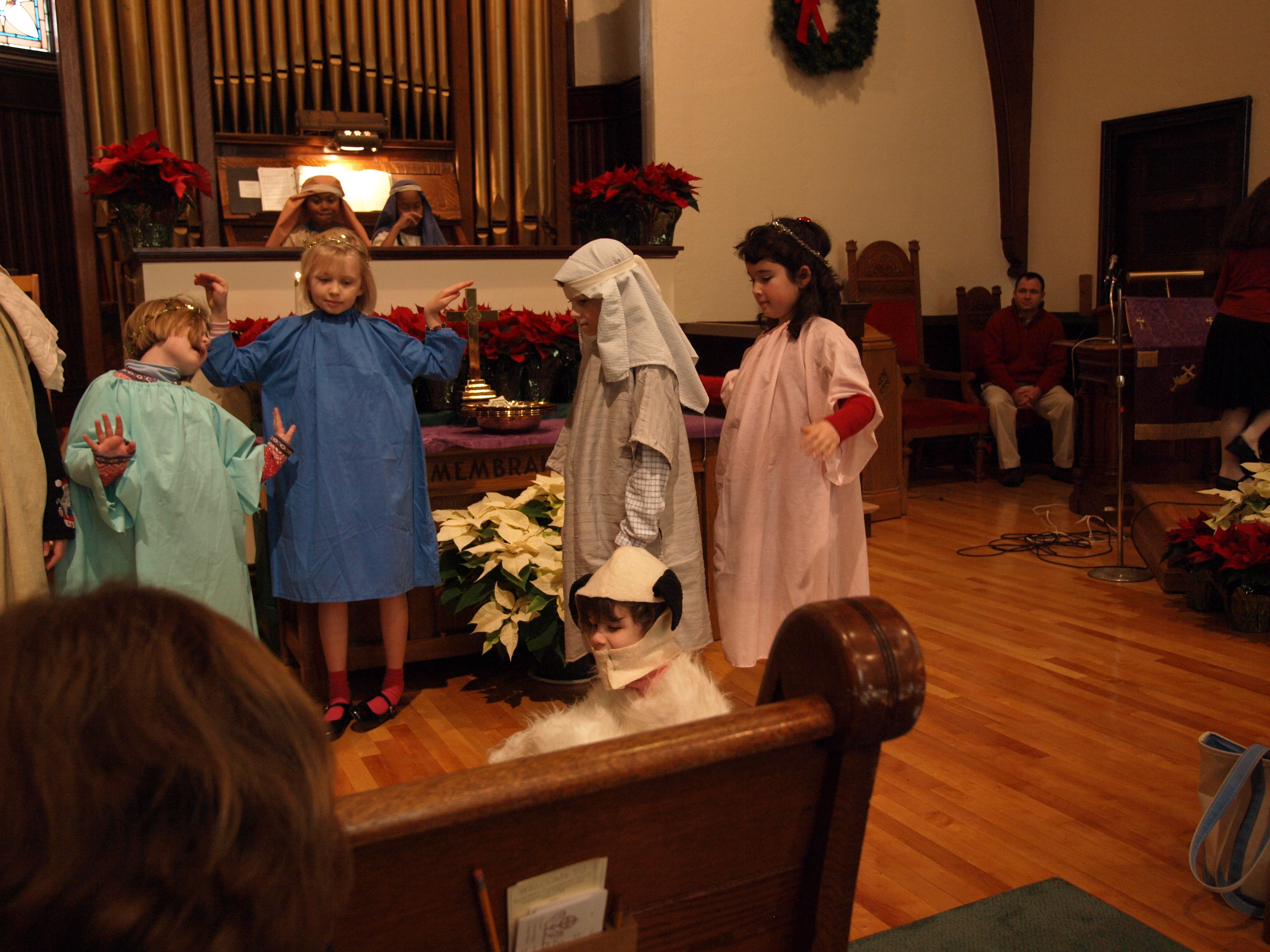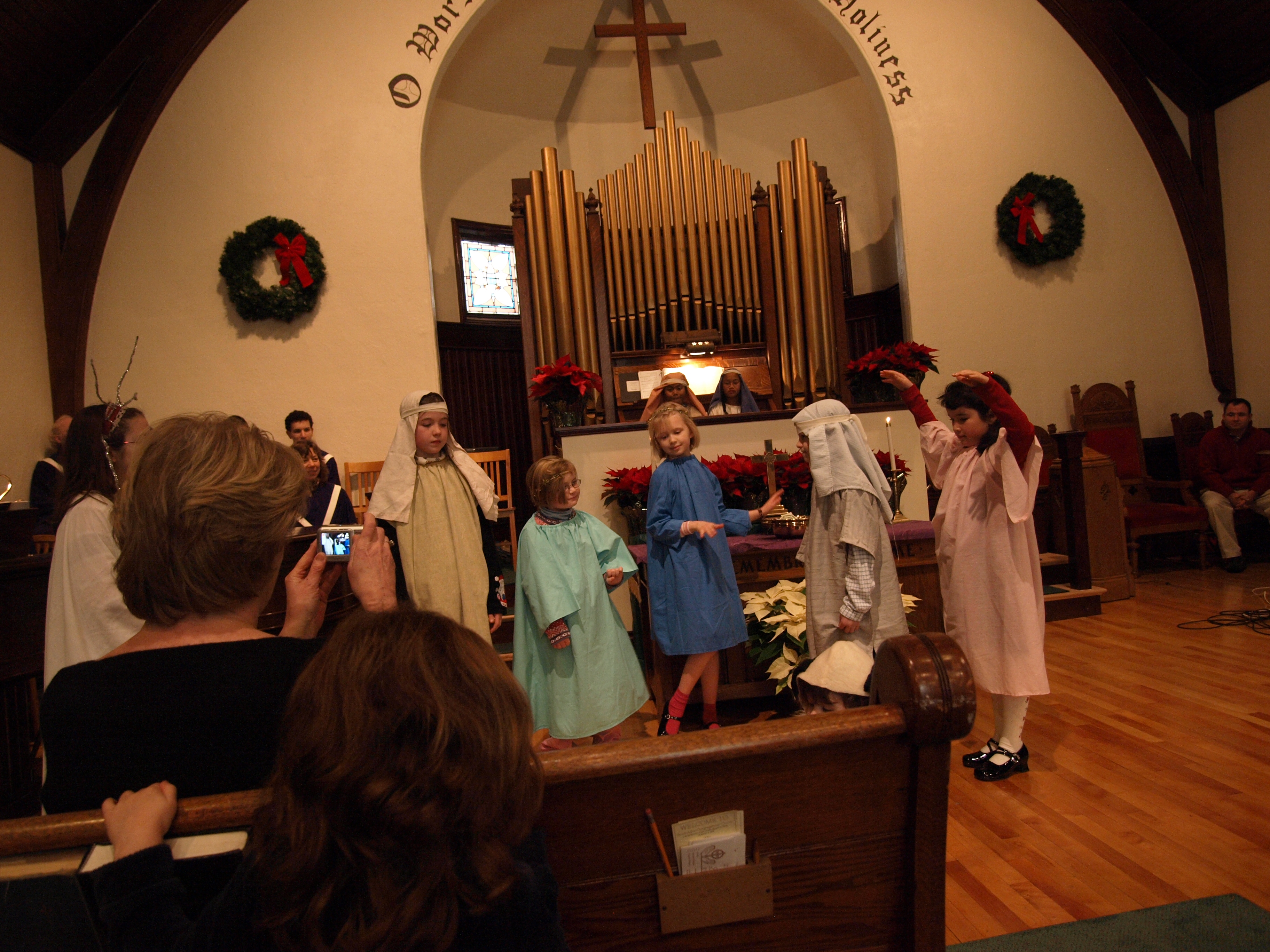 Picture #14: The magi present their gifts Small: 640x503, 83,576 bytes (82K), (html file) Large: 2560x1920, 4,530,668 bytes (4.3M), (html file) Copyright, Michael Meissner 2007, All rights reserved Olympus E-1 camera with Olympus 14-54mm f/2.8-3.5 lens f/2.8, ISO 400, FL-50 flash, 1/30 sec, 14.0mm, auto mode, SHQ, matrix metering, +2 sharpening, continous focus 35mm equivalent focal length 28.0mm Extra equipment used: FL-50 flash Programs used: gimp Taken by Michael Meissner on December 23, 2007 11:11:24 Last modified on December 23, 2007 at 22:35 |
