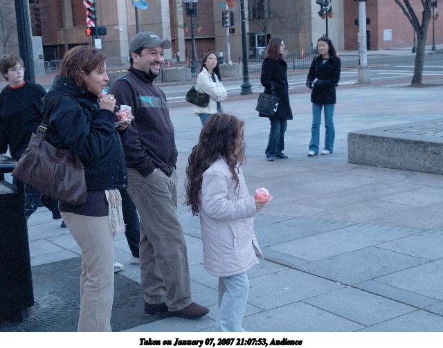 Picture #7: Audience Thumb: 320x240, 28,719 bytes (29K) Small: 640x503, 69,517 bytes (68K), (html file) Olympus E-1 camera with Olympus 14-54mm f/2.8-3.5 lens f/4.5, ISO 400, 1/160 sec, 29.0mm, auto mode, SHQ, matrix metering, +2 sharpening 35mm equivalent focal length 58.0mm Taken by Michael Meissner on January 07, 2007 21:07:53 Last modified on January 07, 2007 at 21:07 |