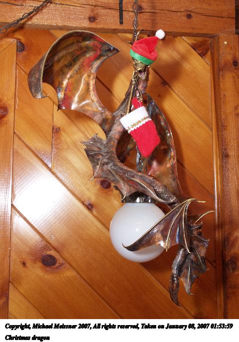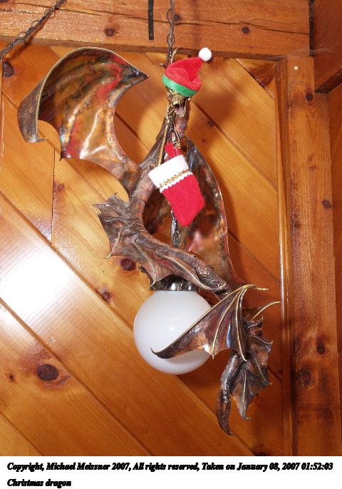 Picture #2: Christmas dragon #2 Thumb: 240x320, 40,053 bytes (40K) Small: 480x686, 81,666 bytes (80K), (html file) Copyright, Michael Meissner 2007, All rights reserved Olympus E-1 camera with Olympus 14-54mm f/2.8-3.5 lens f/8.0, ISO 400, FL-50 flash, 1/40 sec, 22.0mm, aperture priority, SHQ, matrix metering, +2 sharpening 35mm equivalent focal length 44.0mm Extra equipment used: FL-50 flash, Flip-it Taken by Michael Meissner on January 08, 2007 01:53:59 Last modified on January 08, 2007 at 01:53 |
