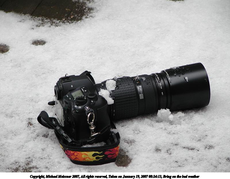 Picture #1: Bring on the bad weather Thumb: 400x300, 24,003 bytes (24K) Small: 800x623, 79,615 bytes (78K), (html file) Copyright, Michael Meissner 2007, All rights reserved Olympus C-2100UZ camera f/2.8, ISO 100, 1/50 sec, 31.1mm, auto mode, SHQ, matrix metering 35mm equivalent focal length 173.0mm Taken by Michael Meissner on January 19, 2007 08:24:13 Last modified on January 19, 2007 at 08:24 |