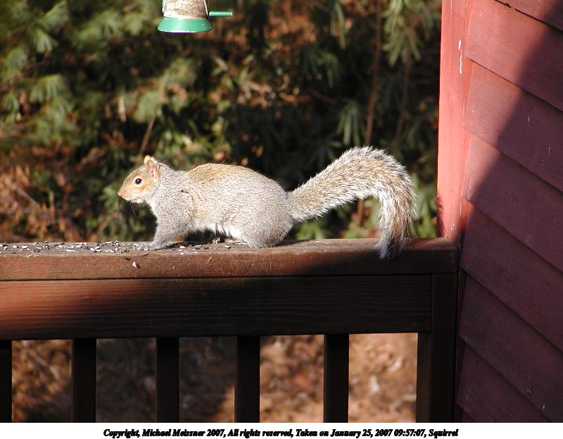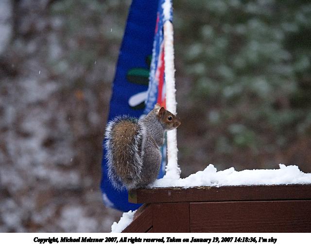 Picture #2: Squirrel Thumb: 400x300, 27,123 bytes (27K) Small: 800x623, 76,739 bytes (75K), (html file) Copyright, Michael Meissner 2007, All rights reserved Olympus C-2100UZ camera f/2.8, ISO 100, 1/320 sec, 37.4mm, auto mode, SHQ, matrix metering 35mm equivalent focal length 208.0mm Taken by Michael Meissner on January 25, 2007 09:57:07 Last modified on January 25, 2007 at 09:57 |