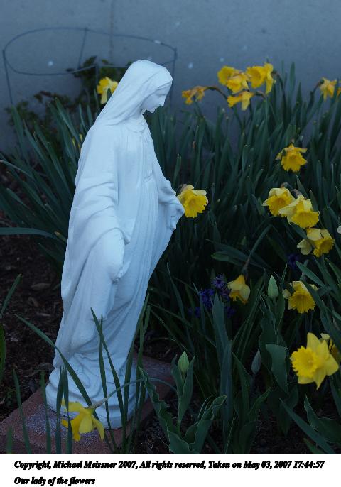 Picture #5: Our lady of the flowers Thumb: 240x320, 27,801 bytes (28K) Small: 480x686, 59,604 bytes (59K), (html file) Copyright, Michael Meissner 2007, All rights reserved Olympus E-1 camera with Olympus 50mm f/2.0 lens f/3.2, ISO 100, 1/250 sec, 50.0mm, auto mode, SHQ, matrix metering, +2 sharpening 35mm equivalent focal length 100.0mm Programs used: rotate Taken by Michael Meissner on May 03, 2007 17:44:57 Last modified on May 03, 2007 at 17:44 I took this at a catholic church when I donated blood to the red cross drive. While the daffodils are bending down because it is the end of the day, it looked like they were paying homage to Mary. |