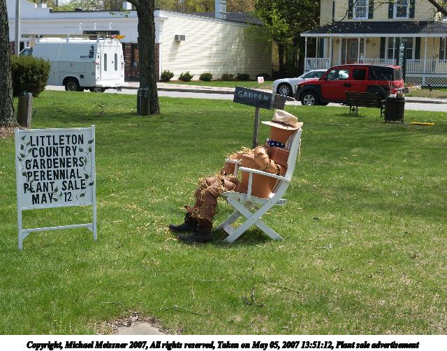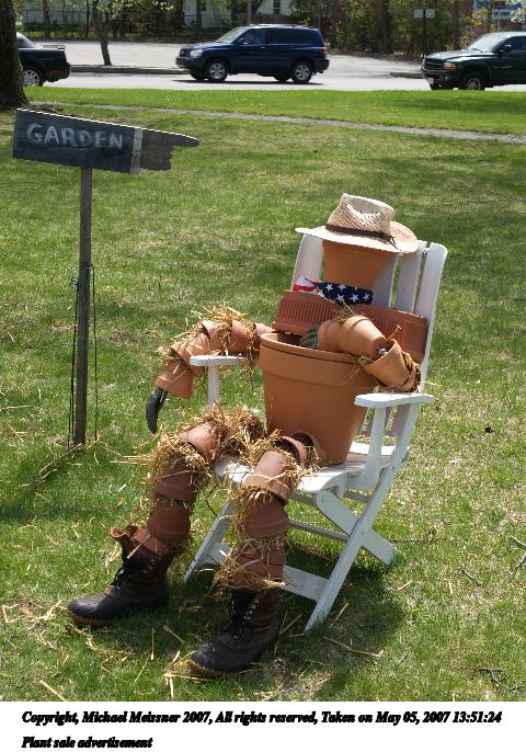 Picture #1: Plant sale advertisement Thumb: 320x240, 31,153 bytes (31K) Small: 640x503, 105,856 bytes (104K), (html file) Copyright, Michael Meissner 2007, All rights reserved Olympus E-1 camera with Olympus 14-54mm f/2.8-3.5 lens f/6.3, ISO 100, 1/250 sec, 32.0mm, auto mode, SHQ, matrix metering, +2 sharpening 35mm equivalent focal length 64.0mm Taken by Michael Meissner on May 05, 2007 13:51:12 Last modified on May 05, 2007 at 13:51 |