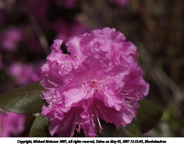 Picture #17: Rhododendron Thumb: 320x240, 22,810 bytes (23K) Small: 640x503, 46,067 bytes (45K), (html file) Copyright, Michael Meissner 2007, All rights reserved Olympus E-1 camera with Olympus 14-54mm f/2.8-3.5 lens f/6.3, ISO 100, 1/400 sec, 54.0mm, auto mode, SHQ, matrix metering, +2 sharpening 35mm equivalent focal length 108.0mm Taken by Michael Meissner on May 05, 2007 13:52:03 Last modified on May 05, 2007 at 13:52 |