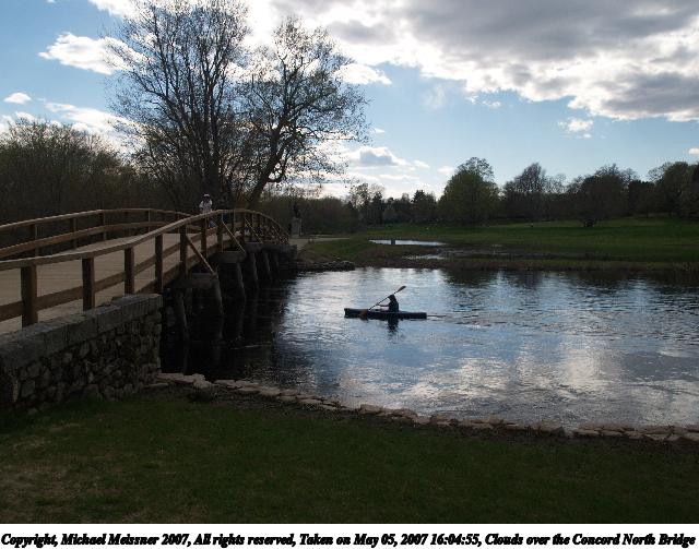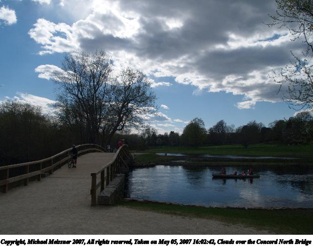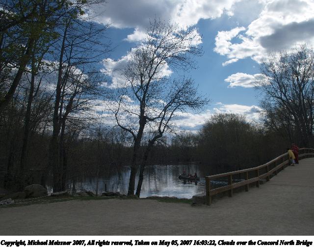 Picture #1: Clouds over the Concord North Bridge Thumb: 320x240, 25,831 bytes (26K) Small: 640x503, 65,557 bytes (65K), (html file) Copyright, Michael Meissner 2007, All rights reserved Olympus E-1 camera with Olympus 14-54mm f/2.8-3.5 lens f/7.1, ISO 100, 1/250 sec, 14.0mm, auto mode, SHQ, matrix metering, +2 sharpening 35mm equivalent focal length 28.0mm Extra equipment used: Polarizer Programs used: gimp Taken by Michael Meissner on May 05, 2007 16:02:42 Last modified on May 05, 2007 at 16:02 |