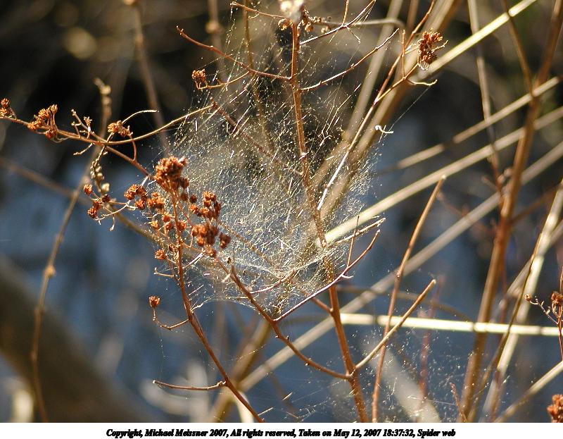 Picture #2: Spider web #2 Thumb: 400x300, 37,234 bytes (37K) Small: 800x623, 111,560 bytes (109K), (html file) Copyright, Michael Meissner 2007, All rights reserved Olympus C-2100UZ camera f/2.8, ISO 100, 1/250 sec, 29.8mm, auto mode, SHQ, cloudy, matrix metering, macro 35mm equivalent focal length 165.0mm Taken by Michael Meissner on May 12, 2007 18:37:32 Last modified on May 12, 2007 at 18:37 Shutter speed of 1/125 or 1/250 may indicate use of flash |