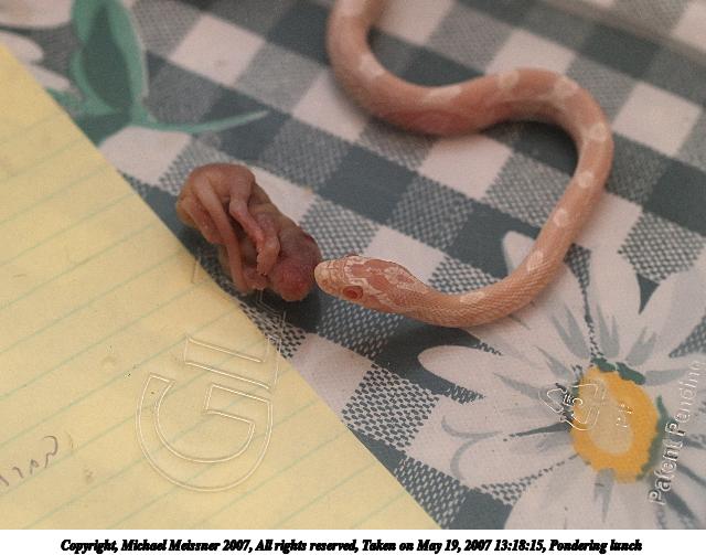 Picture #2: Pondering lunch Thumb: 320x240, 25,449 bytes (25K) Small: 640x503, 56,382 bytes (56K), (html file) Copyright, Michael Meissner 2007, All rights reserved Olympus E-1 camera with Olympus 50mm f/2.0 lens f/4.0, ISO 400, FL-50 flash, 1/100 sec, 50.0mm, aperture priority, SHQ, matrix metering, +2 sharpening 35mm equivalent focal length 100.0mm Extra equipment used: FL-50 flash Programs used: NoiseNinja, gimp Taken by Michael Meissner on May 19, 2007 13:18:15 Last modified on May 19, 2007 at 13:18 |