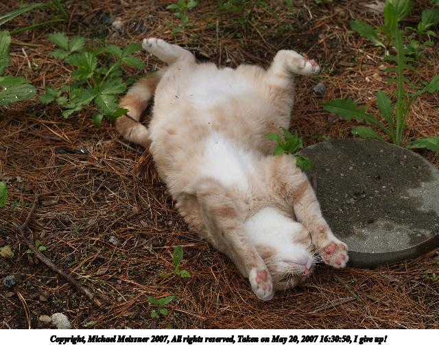 Picture #14: I give up! Thumb: 320x240, 31,343 bytes (31K) Small: 640x503, 93,940 bytes (92K), (html file) Copyright, Michael Meissner 2007, All rights reserved Olympus E-1 camera with Olympus 50mm f/2.0 lens f/4.0, ISO 100, 1/400 sec, 50.0mm, auto mode, SHQ, matrix metering, +2 sharpening 35mm equivalent focal length 100.0mm Taken by Michael Meissner on May 20, 2007 16:30:50 Last modified on May 20, 2007 at 16:30 |