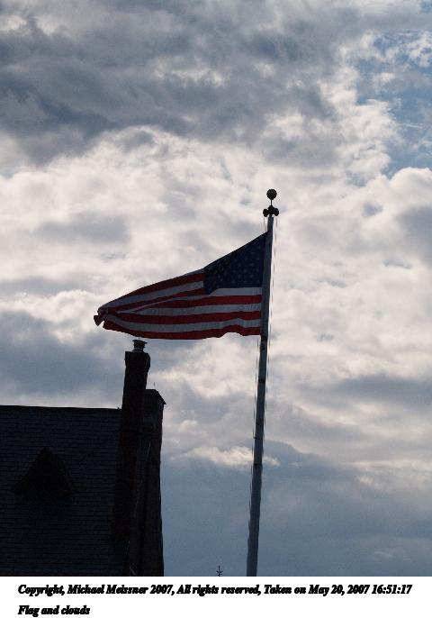 Picture #8: Flag and clouds Thumb: 240x320, 22,289 bytes (22K) Small: 480x686, 46,273 bytes (46K), (html file) Copyright, Michael Meissner 2007, All rights reserved Olympus E-1 camera with Olympus 50-200mm f/2.8-3.5 lens f/10.0, ISO 400, 1/2000 sec, 83.0mm, auto mode, SHQ, matrix metering, +2 sharpening 35mm equivalent focal length 166.0mm Programs used: rotate Taken by Michael Meissner on May 20, 2007 16:51:17 Last modified on May 20, 2007 at 16:51 |