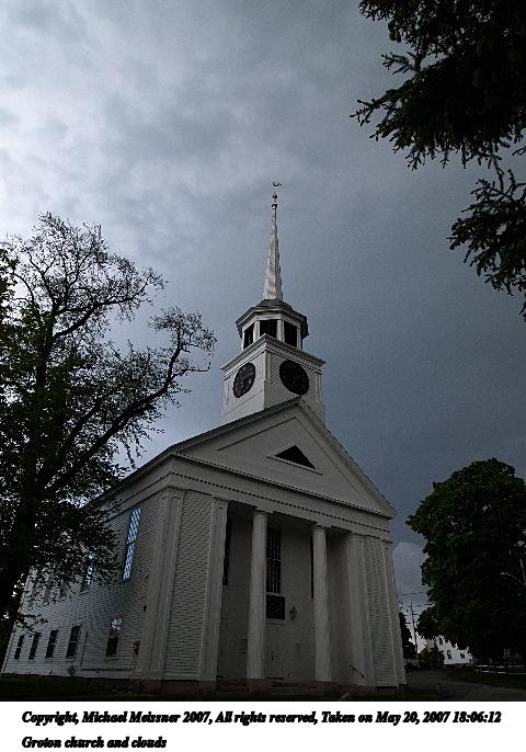 Picture #12: Groton church and clouds Thumb: 240x320, 25,460 bytes (25K) Small: 480x686, 76,402 bytes (75K), (html file) Copyright, Michael Meissner 2007, All rights reserved Olympus E-1 camera with Olympus 11-22mm f/2.8-3.5 lens f/8.0, ISO 400, 1/250 sec, 12.0mm, auto mode, SHQ, matrix metering, +2 sharpening, Exposure bracketing (shot 1) 35mm equivalent focal length 24.0mm Programs used: NoiseNinja, gimp, rotate Taken by Michael Meissner on May 20, 2007 18:06:12 Last modified on May 20, 2007 at 18:06 |